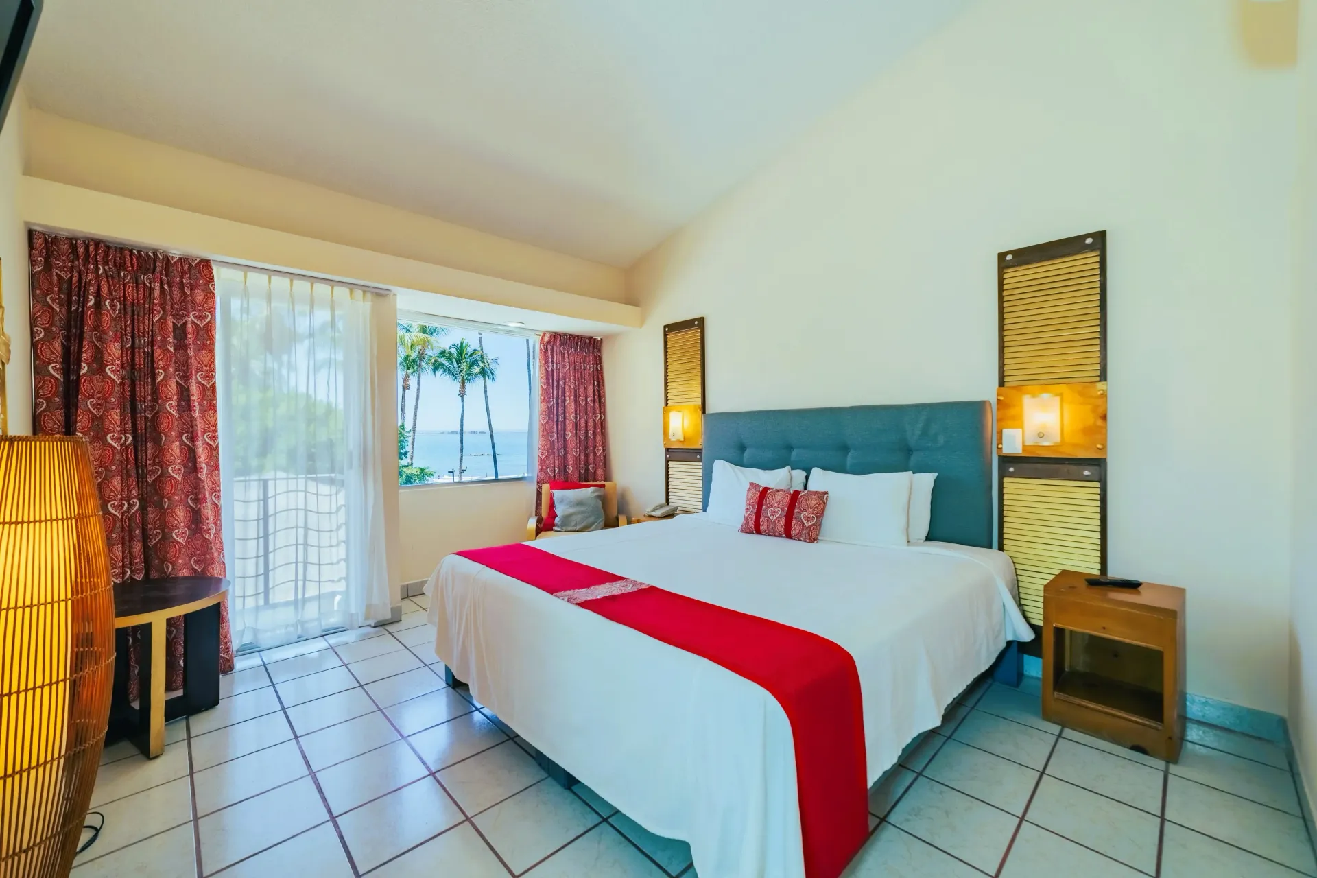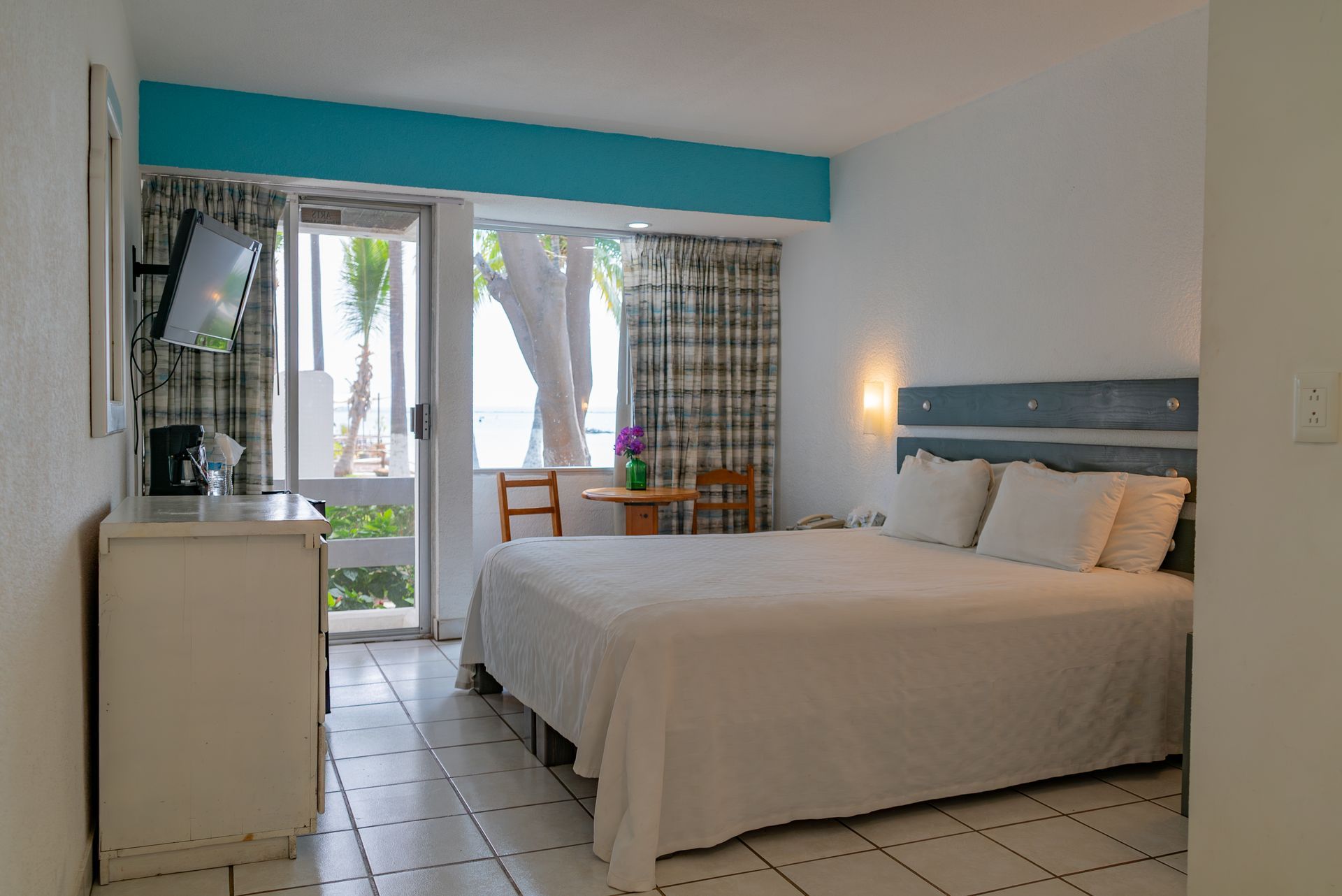 Habitación Estándar Plus con una cama king size con capacidad máxima para 2 personas incluye balcón, vista al mar, aire acondicionado, secadora de cabello, cafetera y minibar.